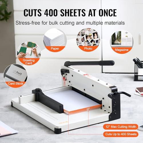 VEVOR Heavy Duty Paper Cutter, 12" Industrial Commercial Guillotine Paper Cutter for A4 Paper, 400 Sheet Capacity, Solid Steel Construction, Stack Paper Trimmer for Office Home School Shop, White