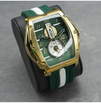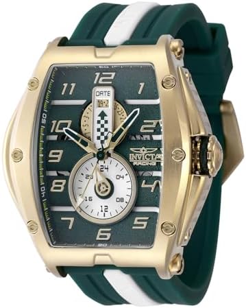 Green dial enhanced by gold-tone hands. Gold-tone stainless steel case with a two-tone (green and white) silicone band. Quartz movement. 100 meters / 330 feet water resistance. Fixed bezel. Scratch Resistant Mineral crystal. Solid caseback. Buckle clasp. Screw Down crown. Case size 57.00 mm x 15.60 mm. Band 24.00 mm x 7.75 incheslong. Invicta 47387 Invicta Racing Watch.