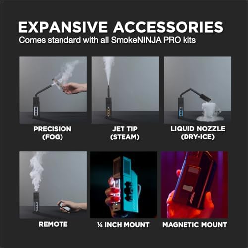 - PORTABLE & COMPLETE KIT: Compact and lightweight design for easy handling in studio and small production environments. The complete kit includes the PMI SmokeNINJA-PRO machine, remote control, 1x atomizing smoke chamber, 1x 100ml of smoke formula refill, new haze nozzle, smoke-shaping nozzle set, and oil blocker, all packed in a protective case to keep everything organized and secure.