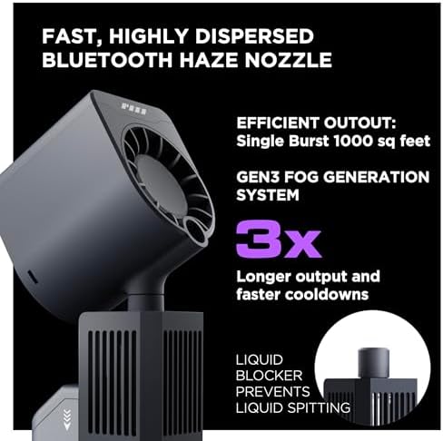 - NEW HAZE NOZZLE WITH BLUETOOTH: Equipped with an all-new third-generation haze nozzle that connects via Bluetooth, providing efficient, quiet, and far-reaching haze. Perfect for creating cinematic effects in various settings.