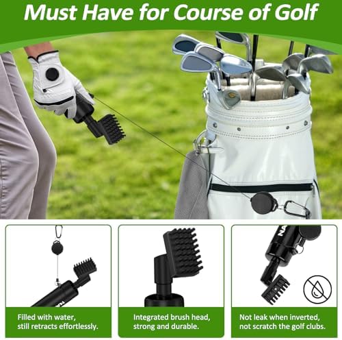 - 【Portable & Convenient】This golf club cleaner with portable bottle is great for cleaning golf clubs and golf balls. It comes with retractable zip-line and aluminum carabiner so you can attach it to your bag or cart easily, and pressure spray water makes cleaning more convenient