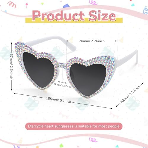 - Shiny Party Decorations: Etercycle heart shaped sunglasses are very cute and suitable for any occasion, such as pool and beach parties, birthday parties, bachelorette parties, music festivals, concerts, travel, carnivals, weddings, etc.Rhinestone glasses are also perfect gifts for family or friends on vacation