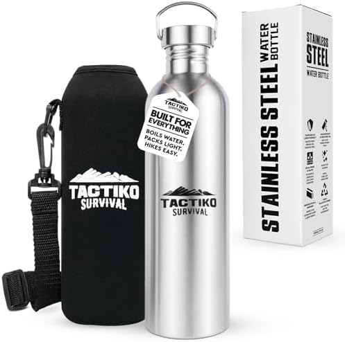 Tactiko Survival Stainless Steel Wide Mouth Water Bottle, Single Wall Boil-Safe, Leakproof, BPA-Free with Carry Sleeve and Strap for Camping, Hiking, Outdoor Prep (Black, 51 oz / 1500 ml)