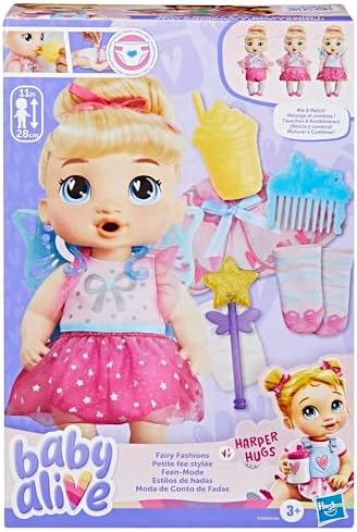 Playtime just got more magical with the mix and match outfits and accessories of the Baby Alive Fairy Fashions baby doll set! Kids can imagine a fantastical playdate with their friend Harper Hugs using the ballerina fairy fashions. Dress her in an adorable pink romper, or layer on the cape and skirt! And no fairy costume is complete without wings -- attach the fairy wing accessory over her shoulders to imagine she's taking flight! Complete the look with ballerina- themed baby doll socks and fairy wand Baby Alive accessories for lots of fun style potentials. Fill her Baby Alive bottle with water that she can really drink. Then, it's time for a diaper change with the 2 included baby doll diapers. Harper has soft hair that kids can comb and fun baby doll accessories. Imagine magical stories with Baby Alive clothes, playsets and dress up dolls for kids. Baby Alive gifts for 3 year old girls and boys are great for kids who like imagination, fairy toys, and baby doll toys! Baby Alive and all related properties are trademarks of Hasbro. Hasbro and all related terms are trademarks of Hasbro.