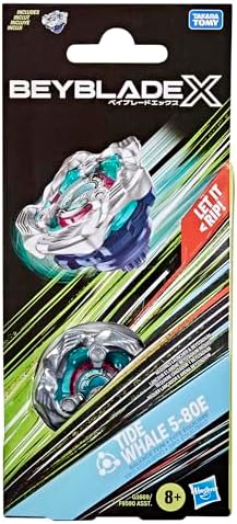 Experience Beyblade X, the next generation of Beyblade stadiums, launchers, and tops! The Beyblade X Tide Whale 5-80E Booster Pack Set includes 1 right-spinning Balance Type top (Beystadium and launcher required, sold separately). Launch right into battle or reconfigure the interchangeable blade, ratchet, and bit of this Booster Pack with those of other Beyblade X tops (sold separately) to create your own unsurpassable top. Beyblade X features the X-Celerator Gear System: The gear of a Beyblade X top engages the rail of the Beystadium arena, super-accelerating the top into an Xtreme Dash around the stadium for crushing collisions and epic bursts. Launch your tops into fierce clashes against opponents’ tops, scoring points with each confrontation – first to score 4 points wins. Hasbro Beyblade toys with authentic Takara Tomy die-cast metal tops make great kids gifts for boys and girls ages 8 and up. HASBRO and all related trademarks and logos are trademarks of Hasbro, Inc.