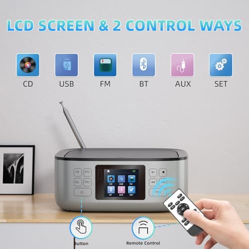 • Desktop Small CD Player: Portable boombox cd player displays five playback modes(CD/USB/FM/Bluetooth/AUX). LED screen enables you more visual to operate the mini cd player. Also can control the cd players for home by button on cd player small or the included remote control