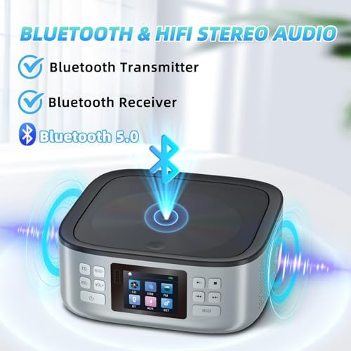 • Multifunction CD Player: Widely compatible with CD, CD-R, HD-CD, MP3. Supports normal playback, single-track repeat, full-track repeat, random play modes and A-B repeat. Portable cd player for car has 5 EQ Mode Flat / Pop / Jazz / Rock / Classic can meet whatever you need on sounds. CD player bluetooth is perfect for kitchen, living room, bedroom, gym, home and office etc.