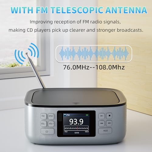 • CD Radio Player for Home: CD player portable built-in full-band FM radio function, can get 76 MHz-108 MHz. You can listen to weather, instant news, music, and traffic information from channels comfortably at home on FM mode. FM telescopic antenna allows the cd radio to pick up clearer and stronger radio signals