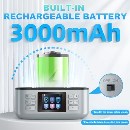 • Boombox CD Player: This cd player with bluetooth is easy to carry and brings you a better using experience. The portable cd player for car comes with an adapter and USB to Type-C cable for easy charging. Please Turn ON the Power Switch on the back of the cd player and fully charge before first usage