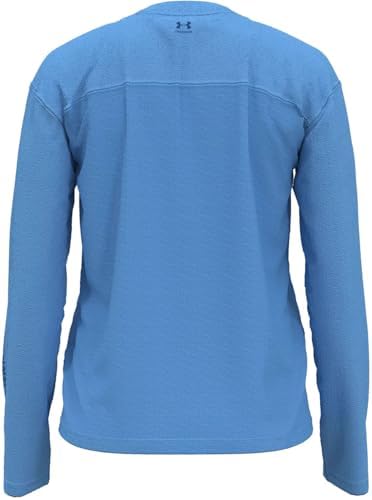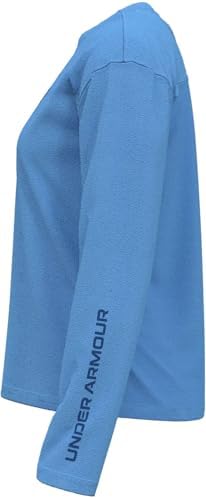 Experience comfort and style with this UnderArmour Women's Long Sleeve Shirt, designed for outdoor enthusiasts and athletes alike. This loose-fit, Carolina Blue shirt features a round neck and long sleeves with a cuff style, perfect for a relaxed yet sporty look. Crafted with a blend of Nylon and Polyester, it offers excellent moisture-wicking and quick-drying properties, keeping you comfortable and dry during intense activities. The Iso-Chill fabric disperses body heat, providing a cool-to-touch feel, while the mesh back panel ensures added ventilation. With UPF 50+ sun protection, this shirt safeguards your skin from harmful rays. The shirt is available in a Medium size, fitting regular body types, and is machine washable with low heat tumble drying for easy care.