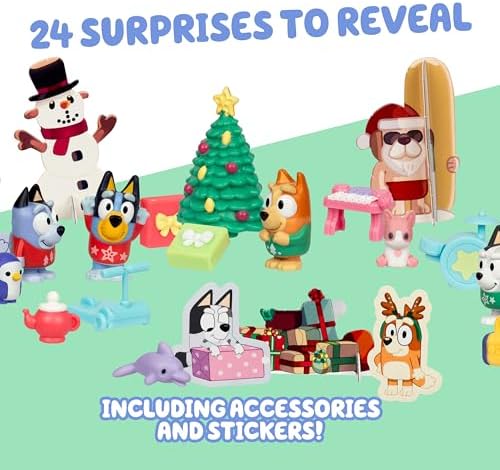- Christmas Advent Calendar: Celebrate the holiday season by counting down the days till Christmas with our advent calendar for toddlers; this Bluey calendar pack includes 4 mini figures, 12 accessories, and 3 paper standees for the festive cheer