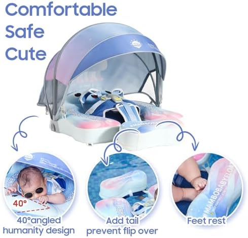 • 【Excellent Material】Outer is upgraded skin-friendly TPU leather fabric. The baby float is soft, smooth and water repellent. Inside is latest tech pearl foam. The mambobaby float with canopy has adorable Jellyfish design, perfect gift to send friends