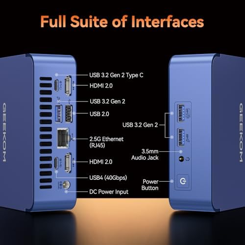 - 【Cooled by IceBlast & Efficient Multitasker】 GEEKOM AX8 Pro mini Computer comes with GEEKOM’s full proprietary IceBlast 1.5 active cooling system. With CPU fan and heat pipes placed strategically to quickly transfer heat away from key components, the mini PC will stay cool and stable when executing heavy workloads.With dual HDMI 2.0 and dual multi-function Type-C ports, the mini PC allows you to distribute computing tasks to up to four 4K monitors at the same time.