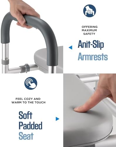 - Non-Slip Armrest & Rubber Feet: The raised toilet seat features non-slip armrests for reliable support when sitting or standing. Rubber feet securely grip the floor preventing slipping or shifting during use and helping seniors and those with limited mobility sit and stand more safely and easily.