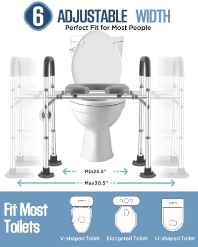 - Adjustable Width & Height: The raised toilet seat with handles offers customizable comfort with seat height adjustable from 19" to 25", handle height from 25.8" to 32", and internal width from 25" to 30". Designed to accommodate users of different heights and fit a wide range of toilet sizes.