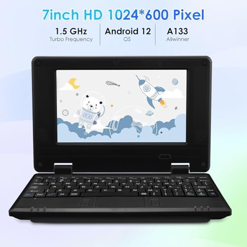 7" Portable Small Laptop, Android 12.0 OS Quad-Core Cortex A53 with 2GB RAM 32GB ROM,Processor A133P Type-C 5V 2A Mini Laptop Notebook for Kids (Black)