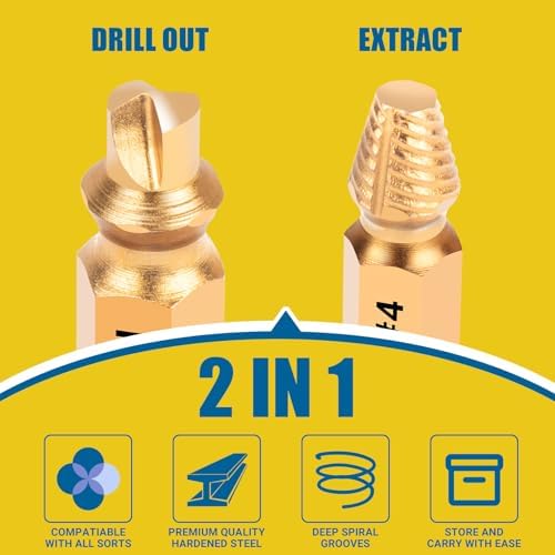 - TITANIUM GOLD-PLATED SURFACE: The double-head damaged screw extractor features HSS 6542, 21% increase in hardness vs. #4341, ensuring hardness and strength. Enhanced with a titanium gold-plated surface, more durable and better resist corrosion than most screw extractors on the market, easy to remove any damaged screws.