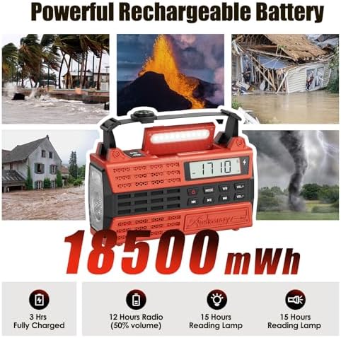 - 【18500mWh (5000mAh) Rechargetable Battery & Power Bank】This hand crank emergency radio is equipped with a powerful 18500mWh rechargeable battery, providing up to 12 hours of radio playback on a single charge. It doubles as a solar radio and hand crank radio/flashlight/cell phone charger, ensuring your essential devices stay powered during emergencies.