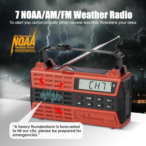 - 【Engineered for Outdoor Adventures & Emergency Preparedness】Designed for both emergency situations and outdoor expeditions, this portable battery operated radio is lightweight, durable, and features an easy-to-read backlit LCD screen displaying battery life, and radio frequencies. Whether camping, hiking, or preparing for hurricanes, this emergency radio hand crank solar AM/FM/ NOAA weather radio is a must-have for every survival kit.