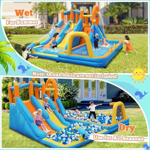 - All-Season Inflatable Adventure Park:Slide into summer fun with inflatable water slides and cool pools. Bounce into winter joy with inflatable bounce house and colorful ball pits. Easily switch between thrilling water slides and indoor bounce house. Whether set up indoors or outdoors, it delivers all-season of fun and excitement for your little adventurer
