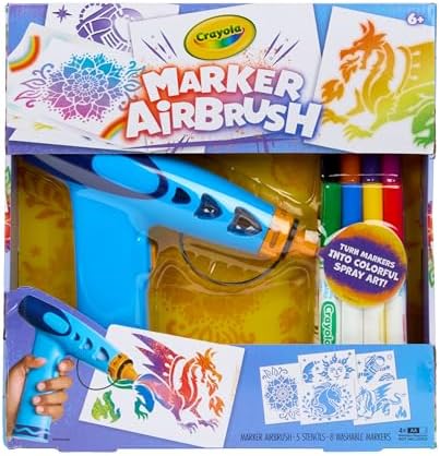Step into a world of spray art magic with the new and improved Marker Airbrush Art Kit! This updated DIY kit is a playground for the imagination, featuring a redesigned Battery-Powered Airbrush, 8 Washable Broad Line Markers, and 5 fresh Reusable Stencils. Kids can easily create stunning spray art—just load a marker and press the button to spray your designs! The included stencils guide young artists to craft a variety of patterns and artwork. The fun doesn’t stop there—kids can experiment with unique spray effects, enhancing their artistic precision and color exploration. And the best part? No need to worry about running out of markers! The airbrush sprayer works with all Crayola Markers, so creativity never has to pause. This set makes a great Christmas gift for kids and a fun holiday present for boys and girls ages 6 and up, perfect for festive celebrations like Hanukkah and family gift exchanges. Let the color adventure begin! (Please note: Marker Airbrush only sprays when pointed downward.) 4 AA batteries required - not included. This product is ACMI Certified.