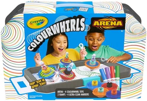Rip ‘Em, Spin ‘Em, and dive into the colorful world of Crayola Colourwhirls! This creative spinning top toy lets kids and adults make vibrant, spiraling art while enjoying exciting battles. Launch your Colourwhirls into the sleek, portable arena—perfect for up to 4 players—and watch as they clash in a whirlwind of color. Use ramps for added action and create unique artwork with every spin. The Colourwhirls Arena Set includes 1 arena, 4 Colourwhirl toys (spinner, handle, rip cord, adaptor, marker holder), 4 Crayola Ultra Clean Markers, 2 ramps, and a carrying case. The washable, reusable surface makes cleanup easy, and you can even add paper to save your creations. Customize recolorable spinner discs and collect all 12 colors for endless fun. Safe, nontoxic, and designed for kids 6 and up, it’s perfect for vacations, summer camp, or on-the-go play. This set makes a great Christmas gift for kids and a fun holiday present for boys and girls, perfect for festive celebrations like Hanukkah and family gift exchanges. Crayola Colourwhirls aren’t just toys—they’re a creative experience. Ready to battle and create? Rip ‘Em & Spin ‘Em! This product is ACMI Certified.