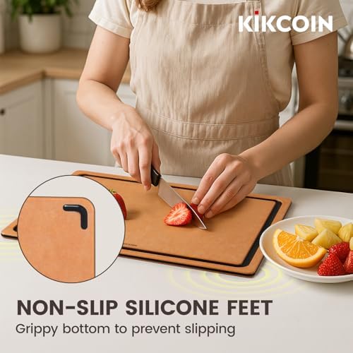 Kikcoin Wood Cutting Board Set of 3, Cutting Boards for Kitchen with Holder Dishwasher Safe Non-slip Chopping Board with Juice Groove, Wood Fiber Composite Cutting Boards