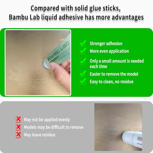 - 【Strong Adhesion & High Success Rate】 This Bamboo Lab original liquid glue is designed for high-speed 3D printing, it ensures perfect fit of the first layer of the model to prevent warping or falling off. It's stable viscosity reduces printing failure rate, avoids waste of filament and your time.