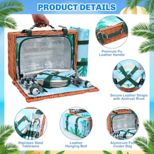 Leinuosen Tropical Wicker Picnic Basket Kit for 4 Persons with Waterproof Green Palm Picnic Blanket Willow Hamper Insulated Cooler Bag Utensils Cutlery for Camping Outdoor Summer Hawaii Luau Party