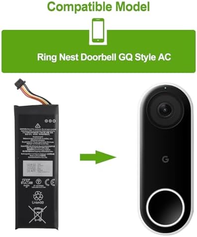 Specification: Part number:GS25 G823-00179-01 Capacity:6000mAh/21.9WH Type:Polymer Compatible models: Google Ring Nest Doorbell GQ Style AC Package includes: -1 x Grade A+ Battery Product Description: ✔1.We don’t provide an instruction manual. You can find instructional videos on YouTube. We always recommend a trained technician replace it. ✔2.To have the best use effect, please use up all the battery power until the phone automatically shuts down, and then fully charge it. Repeat this action 3-5 times to make the battery achieve its best use effect. ✔3. Do not use low quality third-party adapter charger to charge your device, that will shorten the battery's life. Note: 1. Please double check the model number of your device before purchasing to determine if this battery is compatible with your device. 2. Due to lighting and screen differences, product colours may vary slightly from the images. 7.Please do not hesitate to contact us if you have any questions or queries about the products you have received.
