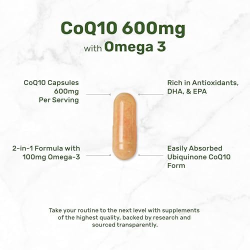 CoQ10 600mg, 120 Capsules – with Omega 3 Fatty Acid 100mg – Max Strength – Bioavailable Coenzyme Q10 Supplements – Heart, Energy, & Brain Health Antioxidant Support – Non-GMO