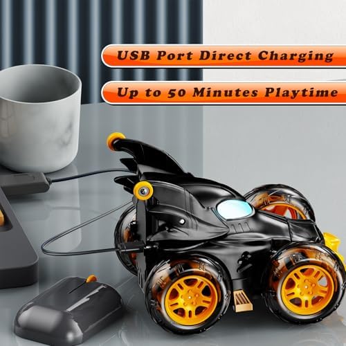 - Fun Stunt & Attractive Light: Our RC cars can make cool stunts, 360 degree rotation flip and 90 degree upright driving, forward and backward, cool bat design and cool lighting effects make your kids can be the center of attention in a crowd.