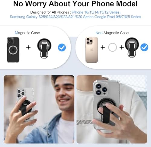 - 【Wide Compatibility for All Phones】: The magsafe ring grip can directly snap onto iPhone 17, Air, 17 Pro,17 Pro Max, 16e, 16 Pro Max, 16 Pro, 16 Plus, 16, iPhone 15 14 13 12 Series, or MagSafe phone cases. The equipped metal ring also makes it compatible with standard phone cases for non-magnetic phones, such as Samsung Galaxy S25 S24 S23 S22 S21 S20 A16 A15 A14 A56 A55 A54 A53 A35, Google Pixel, LG, and other smartphones.