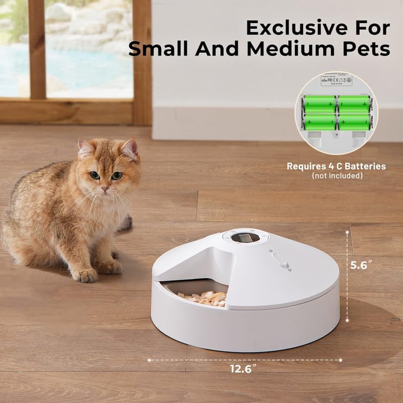 - Battery Operated: The cordless design of this automatic cat feeder allows to be placed anywhere in your home. Powered by 4 C batteries (not included) with up to 180 days battery life, you don't need special batteries, making replacements hassle-free. The UV component operates on 3 AAA batteries (not included).