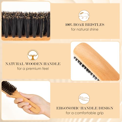 Slick Back Hair Brush for Women Men Kid, Natural Soft Boar Bristle Hair Brush for Thin & Fine Hair, Smoothing Hairbrush for Polishing, Deepening & Styling