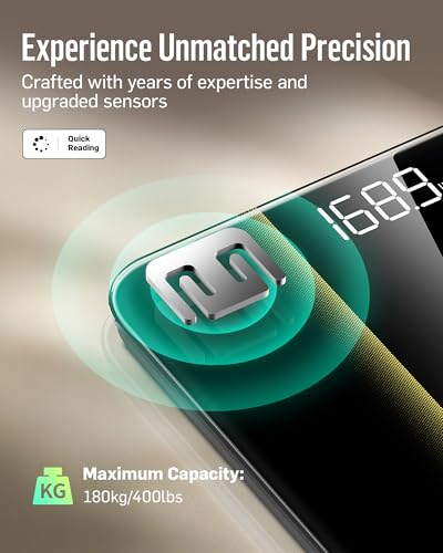 - E𝘅𝗽𝗲𝗿𝗶𝗲𝗻𝗰𝗲 U𝗻𝗺a𝘁𝗰𝗵𝗲𝗱 P𝗿𝗲𝗰𝗶𝘀𝗶𝗼𝗻: With over 30 years of manufacturing expertise and equipped with four upgraded high-precision gravity sensors, this digital bathroom scale can weigh up to 400 lb/180 kg in increments of 0.1 lb/0.05 kg, providing quick and accurate readings every time