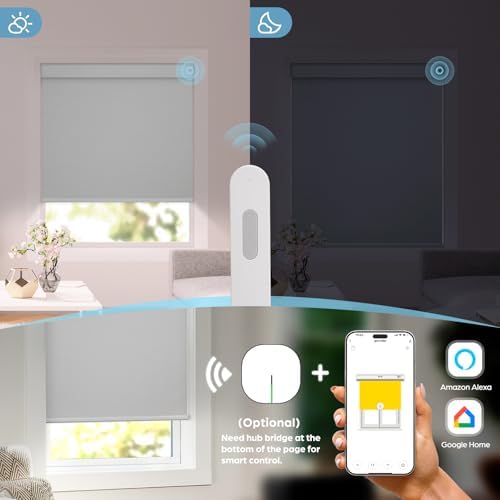 - ★【Smart Blinds】The motorized roller shades come with a single-channel remote. This convenient feature allows you to control the length of the shades effortlessly, enabling you to sit back and enjoy the peaceful ambiance. If you need to control multiple blinds simultaneously, you can choose the optional 15-channel remote (at the page below). With the addition of a smart bridge (compatible with 2.4G WiFi only), you can control the smart blinds via smart devices, as well as through Tuya app.