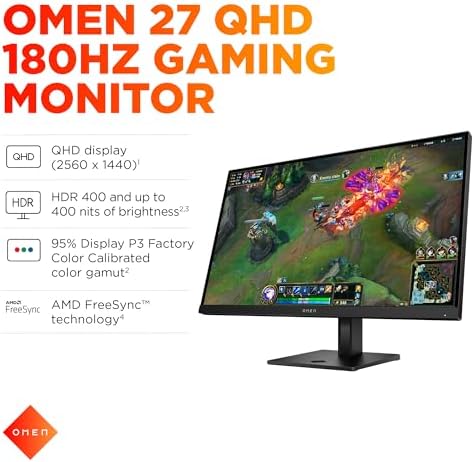 OMEN 27 inch QHD 180Hz Gaming Monitor: Take your fun up a notch. Frame by frame, experience all the action with no distractions. To keep things smooth, this display boasts a fast 180Hz refresh rate and 1ms GTG response time with Overdrive to cut motion blur, so every pixel keeps up with you. Plus, leave screen tearing and lag in the dust, thanks to AMD FreeSync technology. Mistake virtual for IRL while you explore your favorite worlds with the crisp visuals of QHD resolution. For lifelike gameplay, escape into a wide array of vibrant colors, hues, and shades with the 95% Display P3 factory color calibrated color gamut. Even in shadow, easily make out details and shading with HDR 400 and up to 400 nits of brightness. This HP monitor comes with a warranty card, AC power cable, quick setup poster, DisplayPort 1.4 cable, cable holder, base stand, and color calibration report. HP is here to help. This HP monitor comes with HP standard 1-year limited warranty.