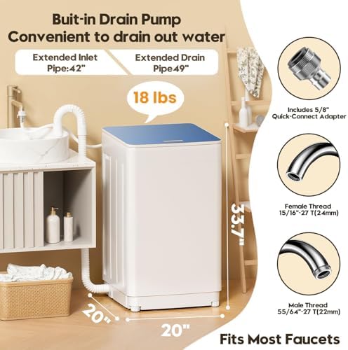 - [Compact & Space-Saving Design] With dimensions of just 20" x 20" x 33.7", this portable washer is designed to fit perfectly in spaces like apartments, dorms, and RVs. It also comes with a faucet adapter for easy installation, ensuring that it meets the water inlet requirements.