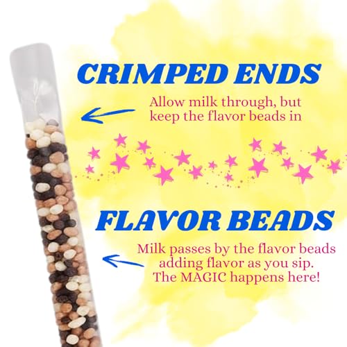 - Mess-Free Design: No more sticky powders or messy mixing! No stirring needed, the flavor beads inside the straw magically mix with your milk so there’s no cleanup.
