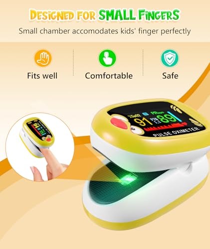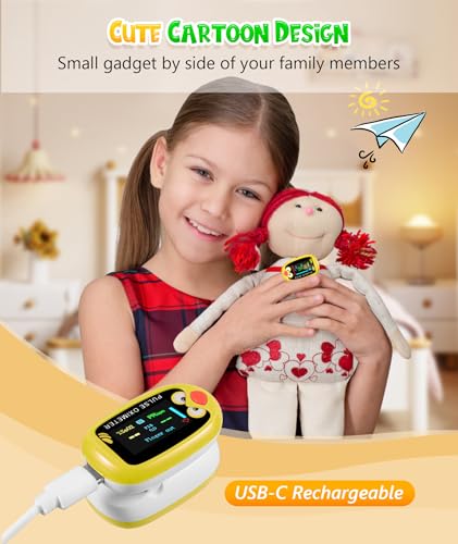 Fingertip Pluse Oximeter for Small Fingers, USB-C Rechargeable Oxygen Monitor, Cute Cartoon Design, Sports & Aviation Use, Applicable for Kids & Children (Yellow)
