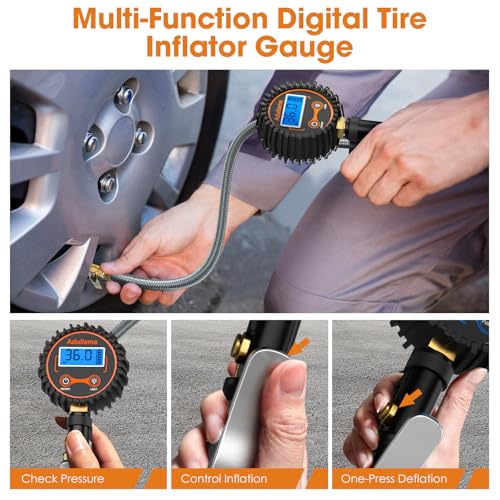 - 3-IN-1 Tire Inflator: The multifunctional tire gauges for tire pressure have 3 functions: deflation, inflation, and tire pressure check. The special handle and stable performance allow you to inflate and deflate at a stable value with one hand; every operation of your finger will be reflected on the LED display. This easy-to-use air pressure gauge for tires can accurately and quickly measure tire pressure without connecting an air compressor, which is very convenient for car use.【NOTE: Batteries are not included in this product】