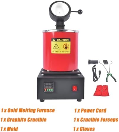 SpecificationColor: RedMain Materials: Steel + Quartz + GraphiteProduct voltage: 110VProduct power: 1500WTime to Reach Max Temp from Room Temp (with Crucible): 25 minutesMelting time: 45-48 minutes (completely melted)Maximum temperature: 1150°C/2102°F(requires individual commissioning by specialized personnel)Product melting capacity: 3KGInner Insulation Layer Thickness: 1.57"/40mmFurnace Body:Inner Diameter ф3.15"/80mm, Depth 5.91"/150mmOuter Diameter Ф6.93"/176mm, Total Height 7.09"/180mmProduct Dimensions:21*23.5*38cm/8.27x9.25x14.96inchProduct Weight:8.8kg/19.4Ibs Package Included1* Gold Melting Furnace1* 3KG Crucible1* Molds1* Clamp1* Plug1* Pair of insulated gloves Instructions1. Plug in the power cord and inspect the machine's appearance and bushings. Carry labor protection equipment, such as gloves, covers, aprons, shoes, etc. Take labor insurance measures. Melt metal into the pile to 70% of its capacity. Place the metal-filled dumpling into the furnace.2. Turn on the O/N power.3. Set the temperature (melting point temperature). In the normal display state of SV/PV, press the "Set" key to make the SV display flash. Each digit can be set. NOTE1. Due to different melting points, the smelting time cannot be unified. The maximum temperature of low frequency is 1100°Cand of medium frequency is 1150°C. Please make a specific choice accordingly.2. This product is only a smelting equipment and does not have a purification function.