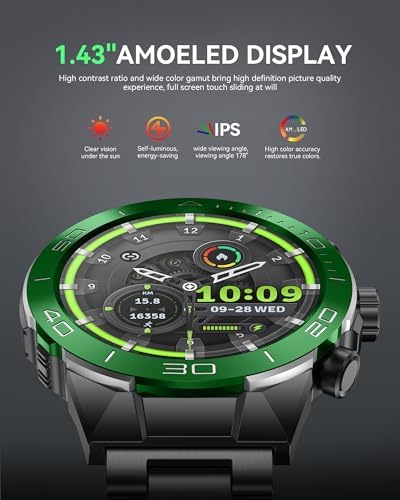 • 【1.43" HD AMOLED, 466x466 Resolution】- SOUYIE SM-7 Men's Smart Watch boasts the market's highest resolution at 466x466. Enjoy a clear, vivid visual experience with anti-glare technology for outdoor visibility. The energy-efficient AMOLED display allows the screen to be always on without draining the battery. Choose from 15 pre-loaded watch faces, add 100+ more from the app, or customize with your family or pet pictures.