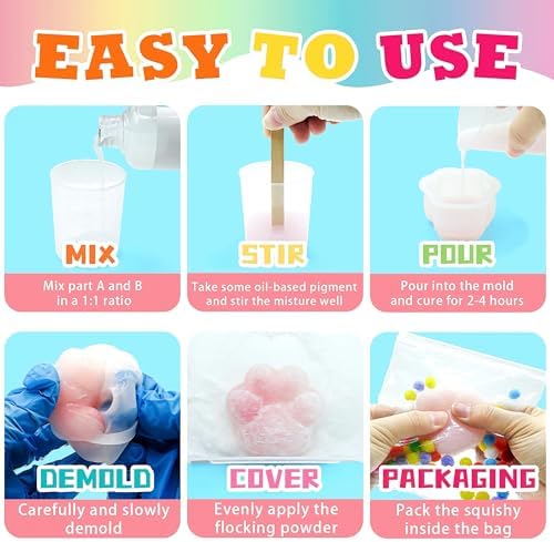 - 【Complete Taba Squishy Making Kit with Guided Instructions】All items to create your initial squishy toy masterpiece: 17.2oz premium liquid silicone for crafting, vibrant color pastes for custom designs, 5 reusable molds for shaping, flocking powder to add texture, mixing cups for material prep, gloves to keep hands clean mid-process, etc., plus a visual step-by-step manual for hassle-free creation. New crafters can use this set to make a cute , squishy effortlessly.