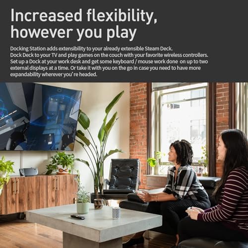 - Adds extensibility to your already extensible Steam Deck. Dock Deck to your TV and play games on the couch with your favorite wireless controllers. Set up a Dock at your work desk and get some keyboard / mouse work done on up to two external displays at a time. Or take it with you on the go in case you need to have more expandability wherever you’re headed.