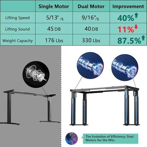 • ⚡ Dual Motor System – Smooth, Quiet, and Reliable Powered by dual motors, the desk adjusts effortlessly at 15mm/s—with ultra-low noise (<50dB) for quiet environments. The four-leg structure adds extra lifting stability and prevents shaking during transitions.