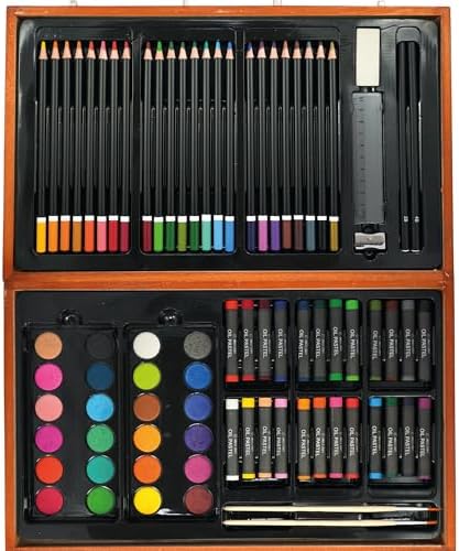 ANGELS CRAFT 80-Piece Artistic Deluxe Set - Art Supplies in Wooden Box for Artists of All Levels - Includes 24 Oil Pastels, 24 Colored Pencils, 24 Watercolors, 2 Brushes and More for Painting, Drawing