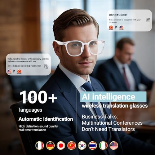 Ai Smart Translation Glasses Simultaneous Interpretation Glasses and Headphones, Bluetooth Language Translator for Men& Women-GS07 Transparent