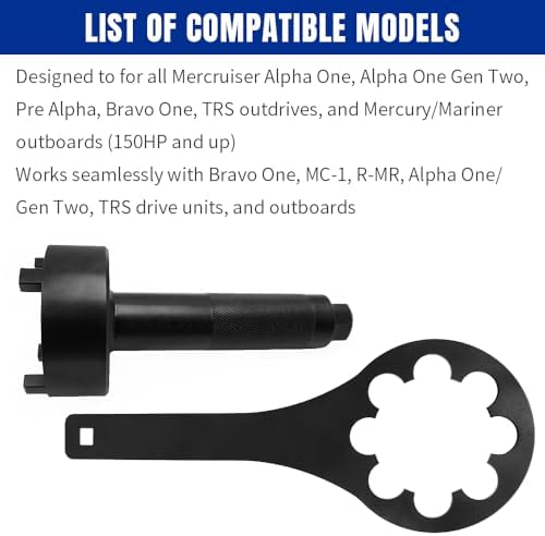 • PRECISE FITMENT: Removes 4-3/8" retainer nut; NOT compatible with Bravo 2, Bravo 3, XR, or TR models. A perfect fit for drive shaft housing (upper) bearing retainer nuts (by U-joint shaft) on #1 (1982 and earlier), R, MR, Alpha Gen 1 (1983-1990), and all Bravo and Blackhawk units